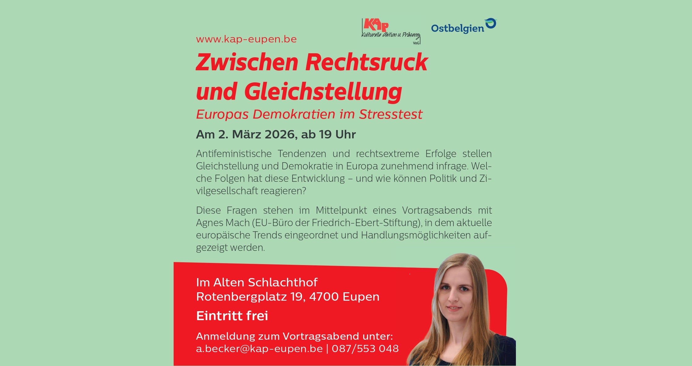 Für die Teilnahme an der Veranstaltung bitten wir um Anmeldung unter: a.becker@kap-eupen.be | 087/55 30 48, spontanes Kommen ist aber ebenfalls möglich.